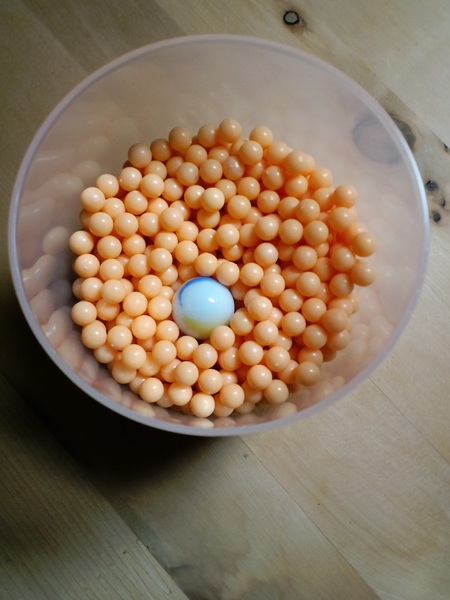 そこには、カップの中に詰まっているプラスチック製BB弾の上に、ビー玉が鎮座しているはずです(右の写真)。最初は下に沈んでいたはずの重いガラス製のビー玉が、軽いBB弾群の上に浮かんでいるさまを見ると、少し不思議に思えるかもしれません。けれど、これは身の回りの色々な「粒」を使って、簡単に確かめることができる現象です。