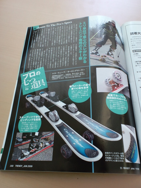日経トレンディ6月号(No.291)で「CARVING ROLLER(カービングローラー)」というものを見つけた。長野県白馬にあるメーカーが作っている、スキー板の下に前2輪・後2輪の車輪が取り付けられた、ローラー・スキー板である。板の上面は、一見すると普通のスキー板で、スキブーツ用ビンディングが取り付けられている。つまり、カービングローラは愛用スキーブーツを履いて滑ることができる。
