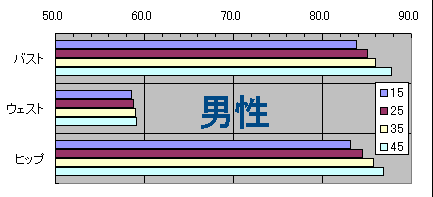 女性の場合、バスト・ウェストに関しては「年をとるにしたがって、理想の数値が微増する」だけであるのに対して、「理想のヒップの数値はとても大きくなっています。色々な想像をしてみると、例えば、「(下半身から太る現実を前にして)理想が現実に引き寄せられている」なんていう原因が想像できます。しかも、そんな「現実と理想のすり合わせ」を、同世代男性側の「豊かなヒップが理想だと思うようになる傾向」がさらに支えていたりするのだろうか?なんていう妄想も浮かんできます。
