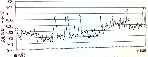 血液中に鉄分溢れる…つまりは鉄道大好きな「鉄っちゃん」ならば、「新幹線電車内での放射線量の変化(東京-京都)」というグラフを一目眺めれば、グラフの各箇所がどの辺りであるかがわかるだろうと思います。たとえば、東京駅側(グラフの左側)から行くと、最初の放射線量の多い辺りが小田原から三島までの長いトンネルが続く辺りだとか、その次の放射線量ピークが蒲原から由比…とトンネルが続く辺りだろう…とか、そして京都駅前の最後の放射線量ピークは、琵琶湖横からトンネルに入り山科から東山に抜ける最後のトンネル辺りだろう…と車窓を思い出しつつ考えるのではないでしょうか。
