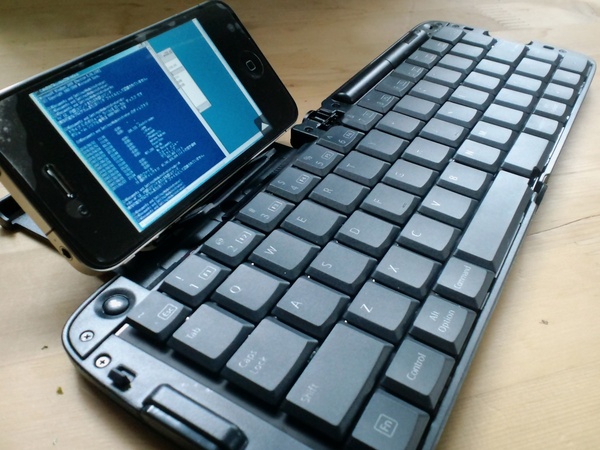 というわけで、ひとつ買ってiPhoneと一緒に持ち歩くと、これが実に便利です。スマートフォンのソフトキーボードでは難しい長文文字入力が簡単にできるというメリットはもちろん捨てがたいのですが、いつでもどこでもプログラミング作業ができるようになる、というのも魅力的です。サーバにssh接続して「好みの言語でプログラムを書いて」みたり、VNCやリモートデスクトップで自分のコンピュータに接続しiPhoneを手のひらサイズのWindowsマシンに化けさせてみたり…ということができる…つまり、いつでもどこでも持ち歩くことができるプログラミングマシンに、iPhoneが変身するのです。