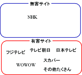 そんなわけで、その後同僚達から集まってきた情報を集めると以下のようになった。例えば、テレビ局のWEBサイトの有害と無害の境界線はこんな感じだ。