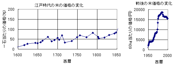 そこで、まずは図書館に行って、「江戸物価辞典」を片手に江戸時代の間に米の価格がどの程度変化していたのかをグラフにしてみた。江戸時代の間に物価がどの程度変化していたかを見てみるわけだ。もちろん、何をもって物価の上昇具合が緩やかなのかあるいは急なのか、という基準が必要なわけで、第二次大戦後の米価格の変化も同じように示してみた。
