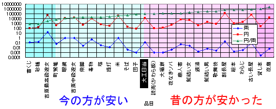 の江戸時代中期の色々なモノの価格をグラフにして並べてみる。また、それらのモノが西暦2001年の現在、何円くらいであるかを私の主観によって判断し、同じようにグラフにしよう。そして、それぞれを比較して、